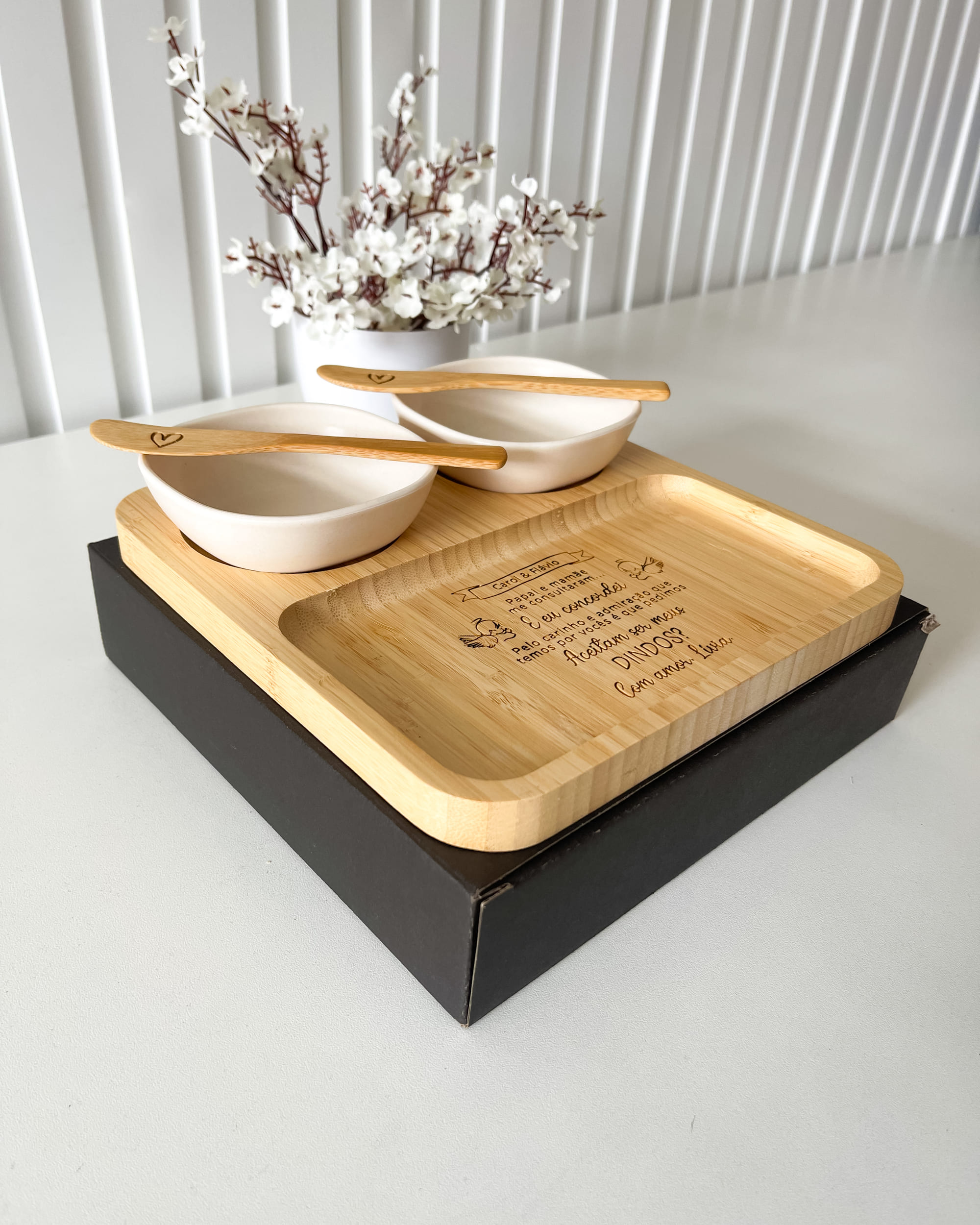 Kit para Petiscos Personalizado em Bambu é mais do que um Presente - é uma expressão de apreço e cuidado. Com sua beleza natural e funcionalidade elegante, este conjunto é uma escolha excepcional para Padrinhos de Batismo os "Dindos". Cada peça é habilmente construída em bambu, um material sustentável que acrescenta um toque de ecoconsciência à sua celebração.