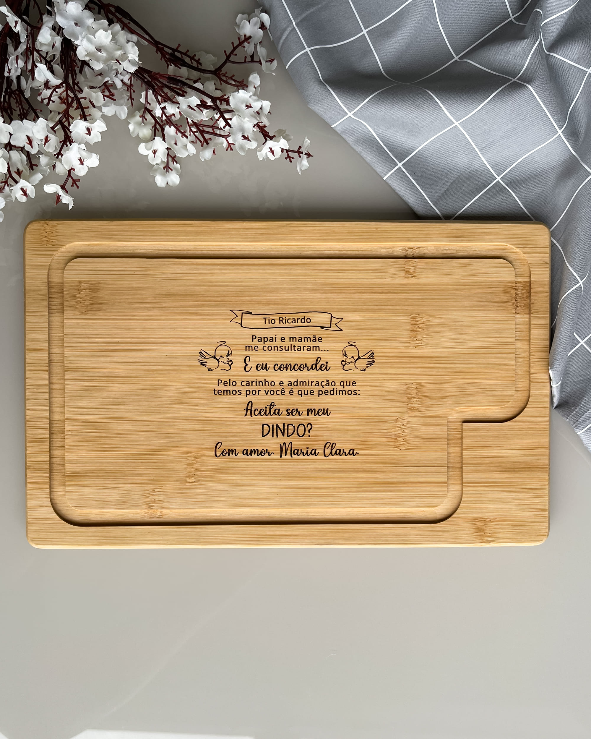 Tábua Personalizada em Bambu é mais do que um Presente - é uma expressão de apreço e cuidado. Com sua beleza natural e funcionalidade elegante, esta tábua é uma escolha excepcional para Padrinhos de Batismo os "Dindos". Feita em bambu, um material sustentável que acrescenta um toque de ecoconsciência à sua celebração.